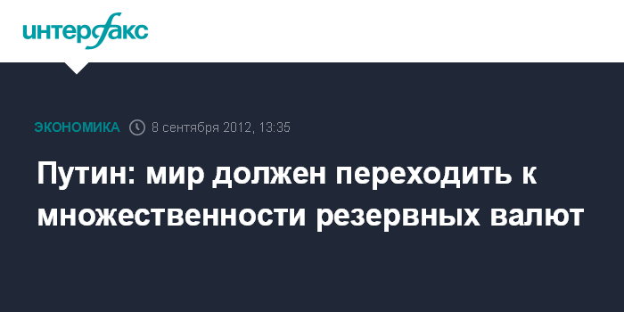 "Если мы хотим избавиться от излишних деривативов, повысить дисциплину и устойчивость мировых финансов, мы должны переходить к множественности мировых резервных валют", - сказал Путин на встрече лидеров АТЭС с членами Делового консультативного совета форума.