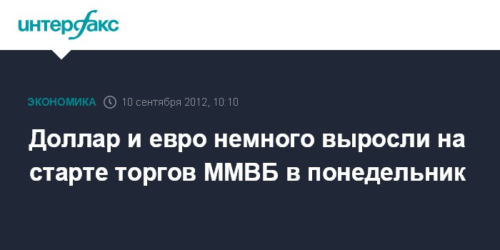 Москва. 10 сентября. INTERFAX.RU - Доллар и евро немного выросли на ММВБ на старте торгов в понедельник, рубль немного снизился по отношению к бивалютной корзине на фоне снижения на фондовом рынке.