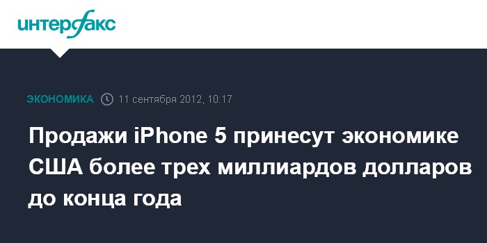 Нью-Йорк. 11 сентября. INTERFAX.RU - Продажи iPhone 5 могут влить в экономику США $3,2 млрд в четвертом квартале 2012 г., пишет MarketWatch.