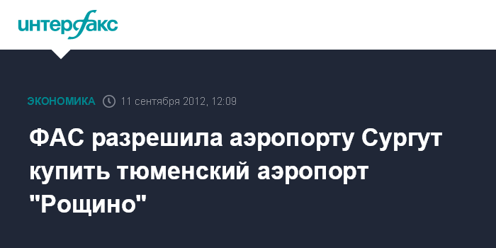 Москва. 11 сентября. INTERFAX.RU - Федеральная антимонопольная служба (ФАС) России одобрила ходатайство ОАО "Аэропорт Сургут" на приобретение 100% акций ОАО "Аэропорт Рощино" (Тюмень), говорится в сообщении регулятора.