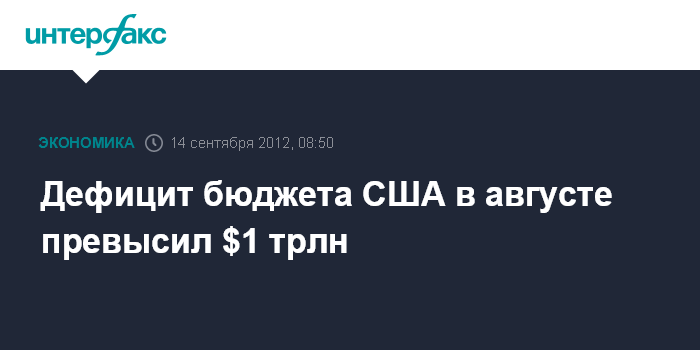 Вашингтон. 14 сентября. INTERFAX.RU - Дефицит бюджета США в августе 2012 года превысил $1 трлн с начала текущего фингода (1 октября 2011 года) и составил $1,16 трлн, свидетельствуют обнародованные в четверг данные министерства финансов США.