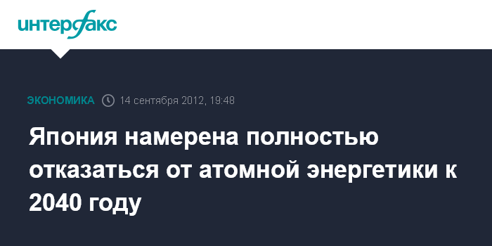 Токио. 14 сентября. INTERFAX.RU - Япония намерена полностью отказаться от атомной энергетики к 2040 г. в соответствии с новой стратегией, одобренной в пятницу премьер-министром страны Йосихико Нодой.