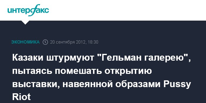 Группа донских казаков в количестве около 20 человек собралась у входа "Гельман галерею", где должна открыться выставка "Духовная брань", идея которой связана с образами Pussy Riot. Казаки выкрикивают лозунг "Либеральный фашизм не пройдет" и пытаются проникнуть в помещение галереи. Они обещают, что в скором времени к "Винзаводу" подтянутся их единомышленники. "С минуты на минуту сюда подойдут еще 200 человек и мало вам не покажется", - пообещал "Интерфаксу" один из казаков.