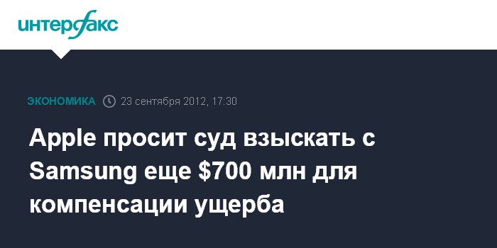 Москва. 23 сентября. INTERFAX.RU - Apple Inc. просит суд увеличить на 707 млн долларов сумму, которую Samsung Electronics Co должен будет выплатить для компенсации ущерба в связи с незаконным использованием патентов американской компании, сообщает The Wall Street Journal.