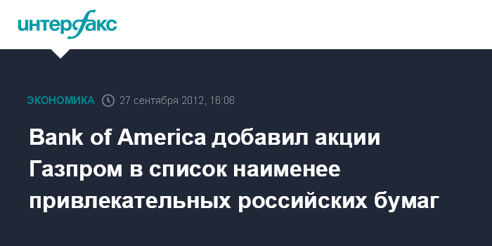 Bank of America добавил акции Газпром в список наименее привлекательных российских бумаг