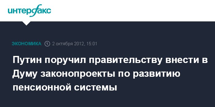Москва. 2 октября. INTERFAX.RU - Президент РФ Владимир Путин поручил правительству организовать общественное и экспертное обсуждение проекта стратегии развития пенсионной системы и до 15 декабря 2012 года внести в Госдуму необходимые законопроекты, сообщил пресс-секретарь президента Дмитрий Песков.