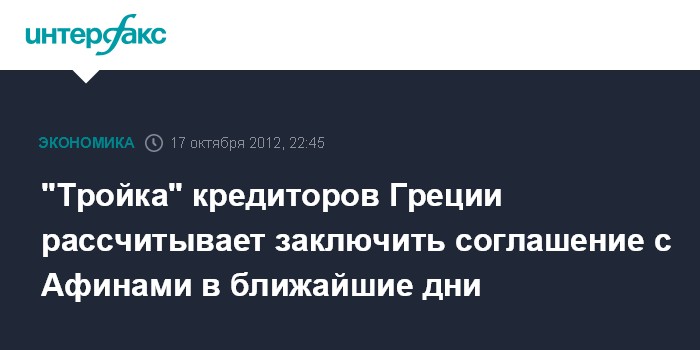 Брюссель. 17 октября. INTERFAX.RU - Еврокомиссия, Международный валютный фонд и Европейский центральный банк заявили в среду вечером, что в ближайшие дни ожидают соглашения с Грецией о реформах, необходимых этой стране для получения кредита в 31,5 млрд евро.