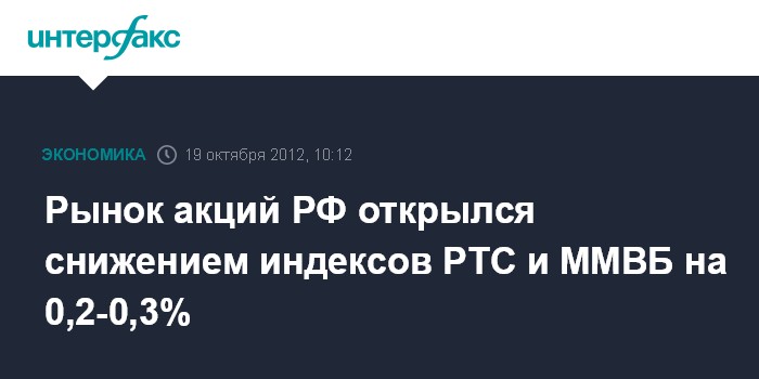 Москва. 19 октября. INTERFAX.RU - Рынок акций РФ открылся в пятницу снижением котировок большинства blue chips на фоне просевших мировых площадок, индексы РТС и ММВБ за минуту торгов просели на 0,2-0,3%.