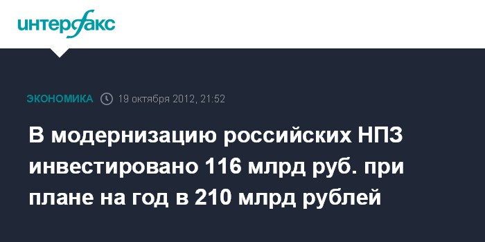 Москва. 19 сентября. INTERFAX.RU - Инвестиции в модернизацию нефтеперерабатывающих заводов в России в январе-сентябре 2012 года составили 116 млрд рублей при запланированном объеме инвестиций на 2012 год в 210 млрд рублей, сообщает "Финмаркет" со ссылкой на материалы Минэнерго, подготовленные для правительства РФ.