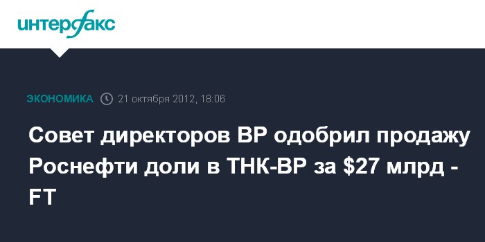 Москва. 21 октября. INTERFAX.RU - Совет директоров BP одобрил продажу "Роснефти" доли в ТНК-BP за $27 млрд, сообщает газета The Financial Times.