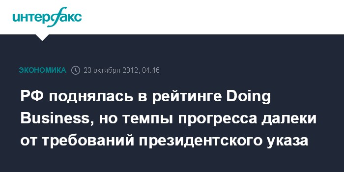 Москва. 23 октября. ИНТЕРФАКС-АФИ - Россия в два раза ускорила свое продвижение в традиционном рейтинге Всемирного банка (ВБ) и Международной финансовой корпорации (IFC) "Doing Business", отражающем условия ведения бизнеса в стране, пройдя в нем восемь ступеней. Годом ранее она поднялась в рейтинге на четыре ступени, заняв 120-е место. Именно с этой скромной позиции России предстояло начать восхождение к топ-20 рейтинга, который власти страны избрали в качестве индикатора успешности своих усилий по улучшению предпринимательского климата.