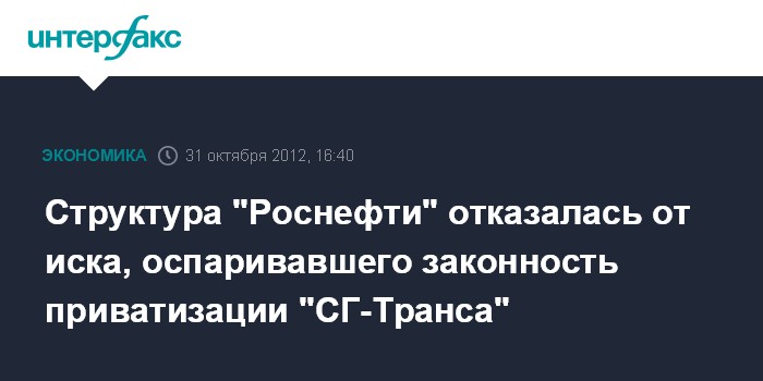 Москва. 31 октября. INTERFAX.RU - Дочерняя компания "Роснефти" "РН-Транс" отказалась от иска, в котором она оспаривала законность процедуры приватизации "СГ-Транса", сообщил судья в ходе слушаний в Арбитражном суде Москвы.