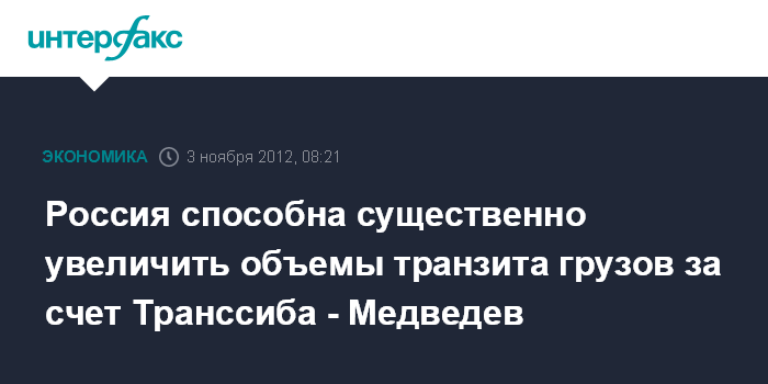"Модернизация и либерализация экономических условий способны обеспечить значительный рост объема транзитных перевозок - не менее 15% общего грузопотока - в сообщениях Европа-Азия, а также - Европа-Азия-Америка. Транссиб способен перевозить до 100 млн тонн в год, и это будет наиболее короткий путь", - отмечает Д.Медведев.