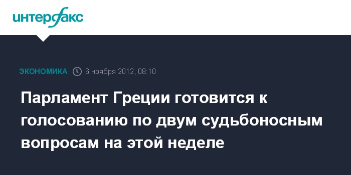 Афины. 6 ноября. ИНТЕРФАКС - Греческий вопрос на этой неделе вновь занимает умы инвесторов, поскольку парламенту страны предстоит провести голосование по двум крайне важным вопросам, чтобы обеспечить получение следующего транша международных кредитов на 31,5 млрд евро.