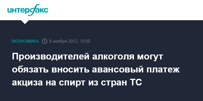 Москва. 6 ноября. INTERFAX.RU - В российское законодательство могут быть внесены поправки, по которым производители алкоголя, импортирующие спирт из стран Таможенного союза (ТС), должны будут вносить авансовый платеж акциза. Соответствующие поправки рассматривались на заседании налогового подкомитета комитета Госдумы РФ по бюджету и налогам во вторник.