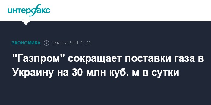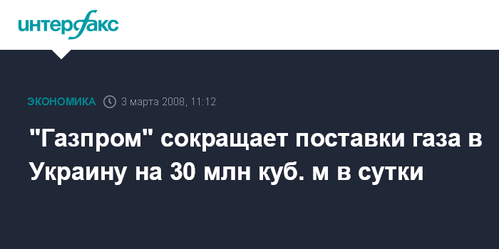 Киев. 3 марта. INTERFAX.RU - Компания "Укртрансгаз", эксплуатирующая систему магистральных газопроводов и подземных хранилищ газа Украины, в 9:34 по киевскому времени получила от ОАО "Газпром" (РФ) уведомление о сокращении поставок газа в Украину на 30 млн куб. м в сутки, сообщили агентству "Интерфакс-Украина" в "Укртрансгазе" в понедельник.