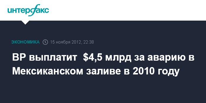 Нью-Йорк. 15 ноября. INTERFAX.RU - Британская нефтяная компания BP в четверг согласилась выплатить крупнейший в истории уголовных преследований в США штраф по обвинениям в связи с аварией на платформе Deepwater Horizon в Мексиканском заливе в 2010 году - $4 млрд, говорится в сообщении компании.