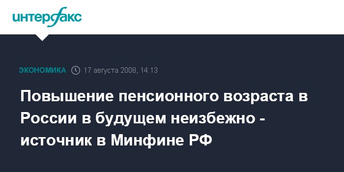 Москва. 17 августа. INTERFAX.RU - Минфин РФ подготовил анализ возможного повышения пенсионного возраста до 62,5 лет для мужчин и женщин, пока не вносит таких предложений, но считает, что повышение в будущем неизбежно, сообщил журналистам источник в Минфине РФ.