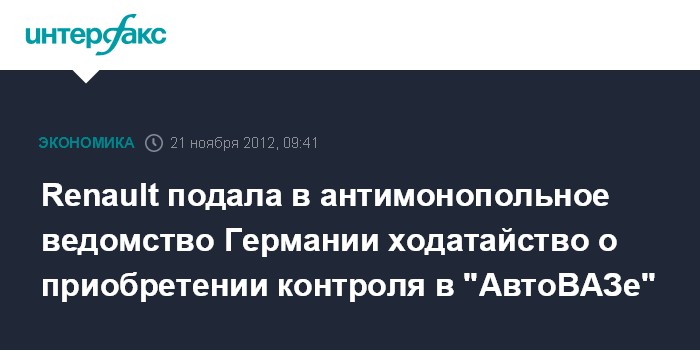 Москва. 21 ноября. INTERFAX.RU - Renault подала в антимонопольное ведомство Германии ходатайство о приобретении контроля в ОАО "АвтоВАЗ". Заявка поступила 15 ноября, говорится в материалах ведомства.