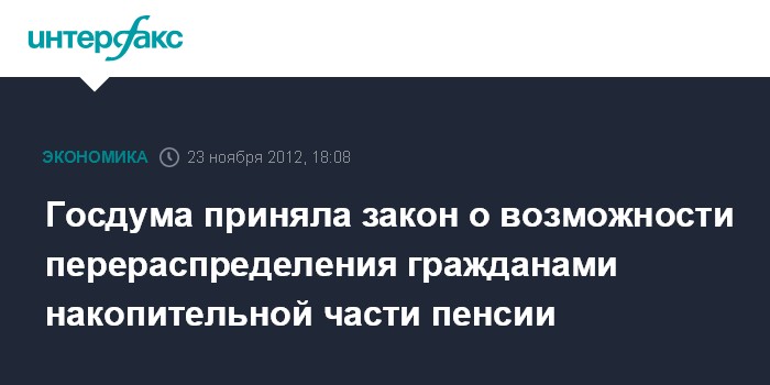 Москва. 23 ноября. INTERFAX.RU - Госдума на пленарном заседании в пятницу приняла во втором и третьем чтениях закон, определяющий механизм распределения накопительной части пенсий граждан с 1 января 2014 года.