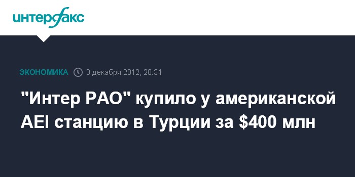 "Интер РАО" купило у американской AEI станцию в Турции за $400 млн
