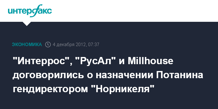 "Интеррос", "РусАл" и Millhouse договорились о назначении Потанина гендиректором "Норникеля"