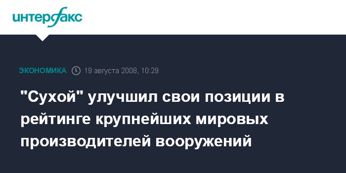 Москва. 19 августа. INTERFAX.RU - Компания "Сухой" на 28 пунктов улучшила свою позицию в рейтинге крупнейших мировых производителей вооружений, опубликованном в августе авторитетным американским военным еженедельником Defense News.