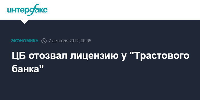 Томск. 7 декабря. INTERFAX.RU - Банк России отозвал с 7 декабря лицензию на осуществление банковских операций у коммерческого банка "Трастовый банк", говорится в сообщении ЦБ РФ.