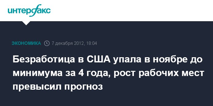 При этом уровень безработицы в США опустился с октябрьских 7,9% до 7,7% в прошлом месяце, что является минимальным значением показателя с декабря 2008 года.