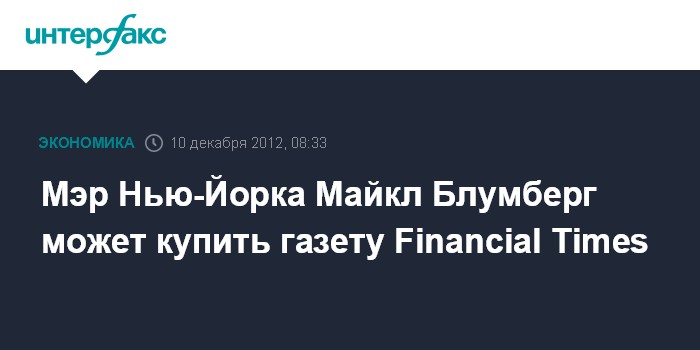 Вашингтон. 10 декабря. INTERFAX.RU - Майкл Блумберг, нынешний мэр Нью-Йорка и основатель информационного агентства Bloomberg, размышляет о плюсах и минусах покупки The Financial Times Group, пишет The New York Times со ссылкой на свои источники.