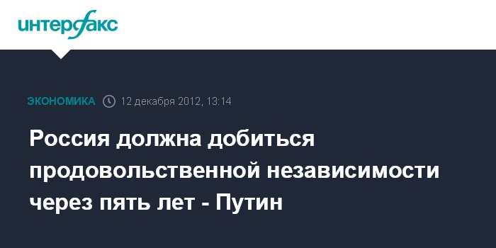 Москва. 12 декабря. INTERFAX.RU - Президент РФ Владимир Путин заявил, что через пять лет Россия должна стать полностью независимой по всем видам продовольствия, а впоследствии - крупнейшим мировым поставщиком.