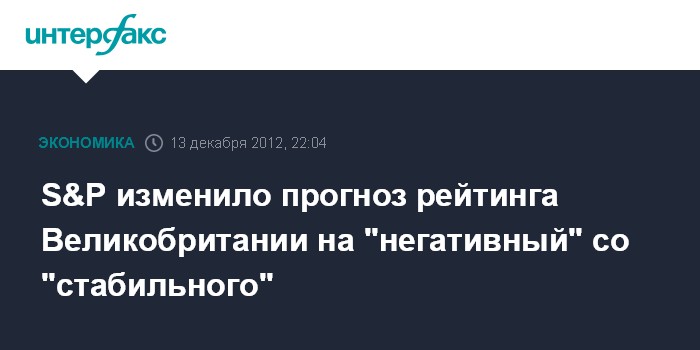 Лондон. 13 декабря. INTERFAX.RU - Международное рейтинговое агентство Standard & Poor's в четверг изменило прогноз долгосрочного рейтинга Великобритании, который находится на уровне "ААА", на "негативный" со "стабильного".