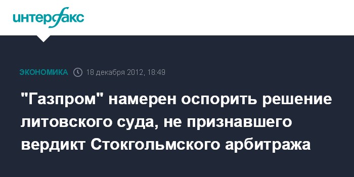 Москва. 18 декабря. INTERFAX.RU - "Газпром" считает решение Апелляционного суда Литвы об отказе признать и разрешить исполнение в стране постановления Стокгольмского арбитража относительно установленной "Газпромом" цены на газ для Литвы абсолютно необоснованным и намерен его оспаривать, сообщили журналистам в управлении информации "Газпрома"