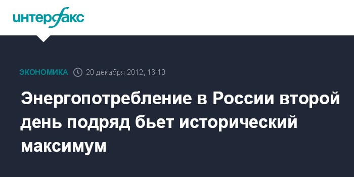 Москва. 20 декабря. INTERFAX.RU - Потребление электрической мощности в Единой энергосистеме России и энергосистеме Москвы и Московской области второй день подряд достигает максимального уровня за всю историю их существования.