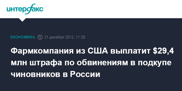 Фармкомпания из США выплатит $29,4 млн штрафа по обвинениям в подкупе чиновников в России
