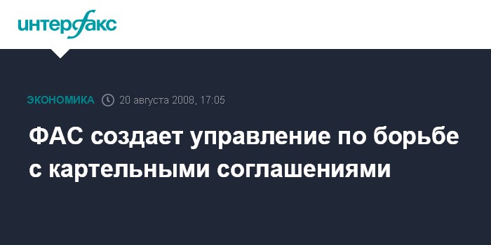 Москва. 20 августа. INETRFAX.RU - Федеральная антимонопольная служба (ФАС) РФ приняла решение создать в своей структуре управление по борьбе с картельными соглашениями, которое будет взаимодействовать с МВД, и управление по контролю за действиями органов государственной власти.