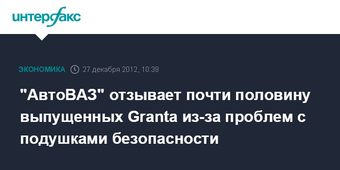 Москва. 27 декабря. INTERFAX.RU - ОАО "АвтоВАЗ", крупнейшее российское предприятие по выпуску легковых автомобилей, отзывает 45,348 тыс. автомобилей бюджетной модели Lada Granta для перепрограммирования блока управления системы подушек безопасности, сообщила компания в четверг.