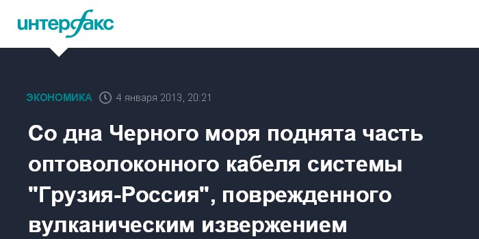 Тбилиси. 4 января. ИНТЕРФАКС - Со дна Черного моря в 61 километре от грузинского порта Поти в пятницу поднята часть оптико-волоконного магистрального кабеля Поти-Сочи-Новороссийск (входит в подводную кабельную систему "Грузия-Россия"), которая была повреждена 23 декабря в результате вулканического извержения, сообщил "Интерфаксу" исполнительный директор ООО Foptnet Котэ Самушия.