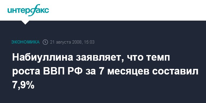 Москва. 21 августа. INTERFAX.RU - Показатель роста ВВП России за 7 месяцев 2008 года составил 7,9%, сообщила министр экономического развития РФ Эльвира Набиуллина журналистам после заседания правительства. "Темпы роста ВВП остаются достаточно высокими", - сказала она.