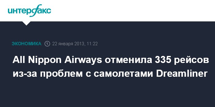Москва. 22 января. INTERFAX.RU - Японский авиаперевозчик All Nippon Airways Co. аннулировал в общей сложности уже 335 рейсов по всему миру из-за проблем с самолетами Boeing-787 Dreamliner.