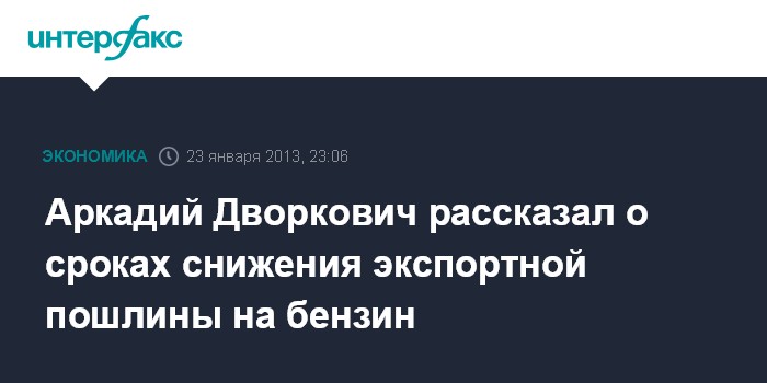 Давос. 23 января. INTERFAX.RU - Экспортная пошлина на бензин будет снижена с 2015 г., возможно с 2014 г., сообщил вице-премьер Аркадий Дворкович. "С моей точки зрения (пошлина будет снижена - ИФ) точно с 2015 года, но возможно с 2014 года. Это предстоит еще обсудить", - заявил Дворкович на брифинге в рамках Всемирного экономического форума в Давосе в среду.