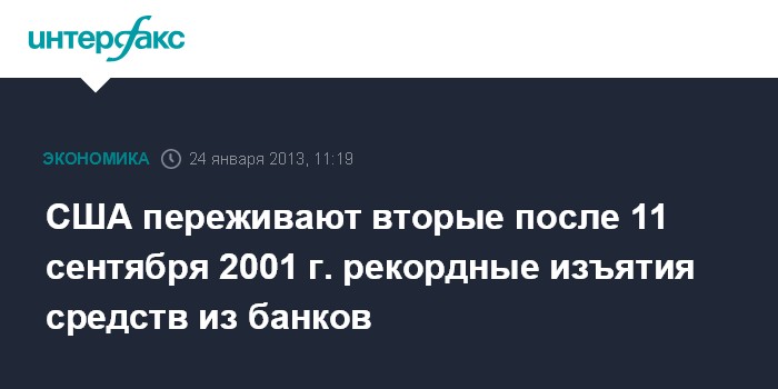 Нью-Йорк. 24 января. INTERFAX.RU - Клиенты крупнейших банков США изымают свои средства рекордными темпами со времени террористических атак 11 сентября 2001 года, в частности, из-за окончания программы страхования депозитов, сообщило агентство Bloomberg.
