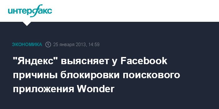 Москва. 25 января. INTERFAX.RU - Facebook заблокировал возможность поиска контента в соцсети с помощью экспериментального поискового приложения Wonder, запущенного накануне российской интернет-компанией "Яндекс".