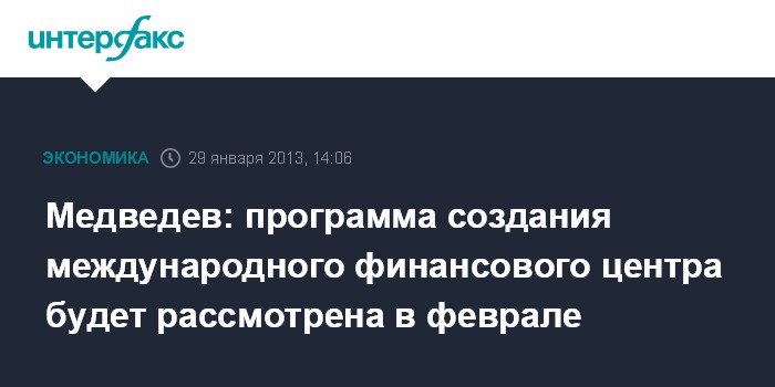 "В ближайшее время, в феврале текущего года правительство рассмотрит государственную программу развития финансового и страхового рынков и создания международного финансового центра", - сказал премьер-министр РФ Дмитрий Медведев на совещании по вопросам создания МФЦ.