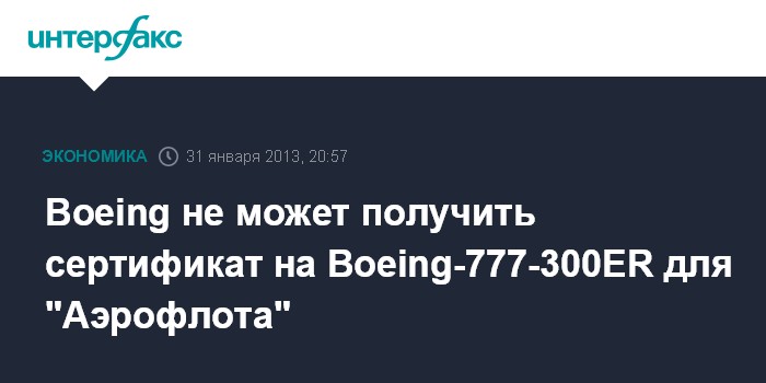Москва. 31 января. INTERFAX.RU - Компания Boeing не может получить сертификат типа АР МАК на самолет Boeing-777-300ER для ОАО "Аэрофлот - российские авиалинии", сообщил "Интерфаксу" официальный представитель Росавиации.