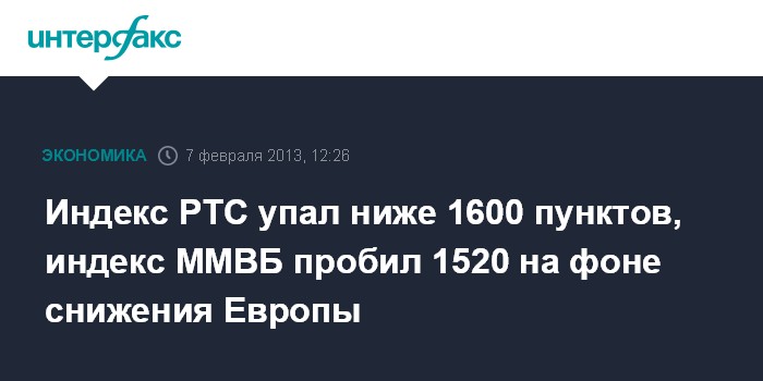 Москва. 7 февраля. INTERFAX.RU - Рынок акций РФ днем в четверг упал ниже поддержек 1520 пунктов по индексу ММВБ и 1600 пунктов по индексу РТС, достигнув уровней 22 января, на фоне негативного открытия Европы в преддверии итогов заседания Европейского Центробанка.