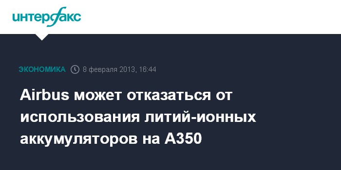 Тулуза. 8 февраля. INTERFAX.RU - Европейский авиастроительный концерн Airbus рассматривает возможность установки стандартных аккумуляторов на авиалайнерах A350 и планирует отказаться от использования литий-ионных аккумуляторов, инциденты с которыми произошли на самолетах Boeing-787 Dreamliner, сообщает агентство Bloomberg со ссылкой на информированные источники.
