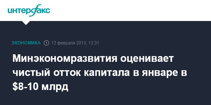 Москва. 12 февраля. INTERFAX.RU - По оценке Минэкономразвития, чистый отток капитала из РФ в январе 2013 года составил $8-10 млрд, сообщил журналистам директор сводного департамента макроэкономического прогнозирования министерства Олег Засов.