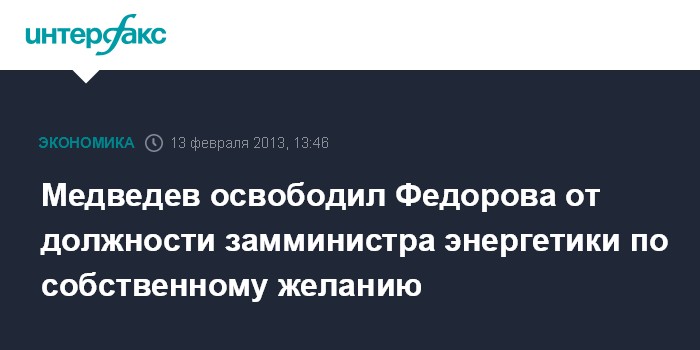 Москва. 13 февраля. INTERFAX.RU - Заместитель министра энергетики Павел Федоров освобожден от должности по собственному желанию.