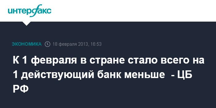 К 1 февраля 2013 г. количество действующих кредитных организаций составило 955, сократившись за месяц на 1.